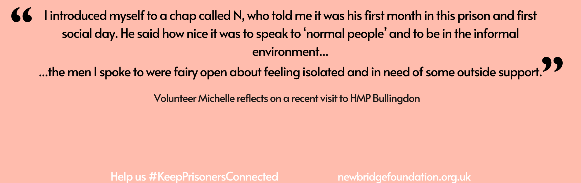 Our volunteers often have the opportunity to attend prison-organised social days, alongside their befriending.  If you are interested in volunteering with us then you can find out more here: https://www.newbridgefoundation.org.uk/volunteer